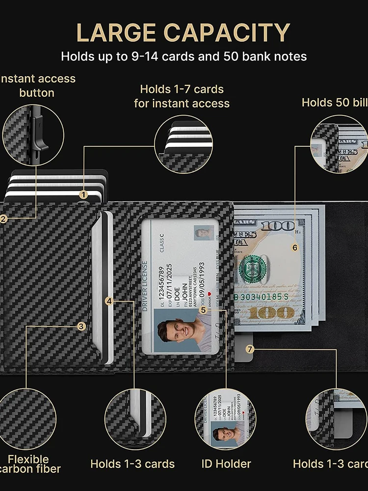 Keep your cards secure and organized with this ultra-thin pop-up metal wallet. Featuring an AirTag positioning slot, RFID protection, and a sleek, minimalist design, it safeguards your credit cards and personal data.